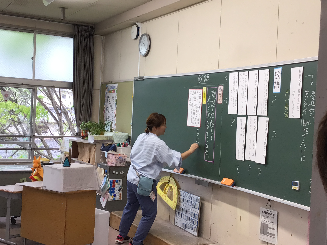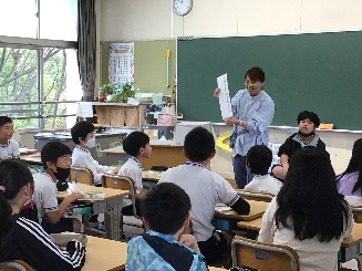 谷中先生の隣に座っている子を校長先生役に見立てて、「給食食べた?」と聞いています。「なんか、変だね」「友だちみたい」「失礼じゃない?」などの意見が出ていました。