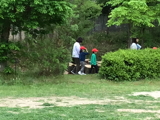桑山先生に、花壇に植えてある花や周辺に生えている草の名前を教えてもらっています。