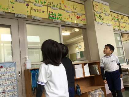 廊下上部に飾ってあるお友達の絵から新たなヒントをもらい、自分の絵に生かすそうです。2年生で、これだけ受け答えできるなんてすごいなと思い、「上手にお話してくれてありがとう。新しいヒントが見つかるといいね」と声を掛けました。