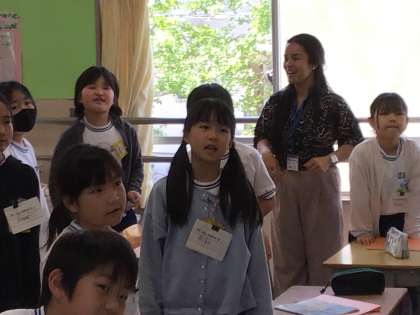 ジョニ先生、松宮先生から英語でいくつか質問がだされ、2組のみんなが答えていました。