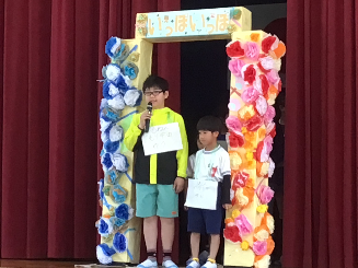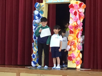 入場で6年生が1年生の紹介コメントを話し、一緒にポーズを決めます。