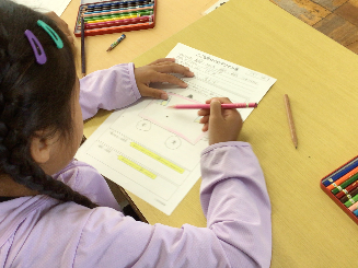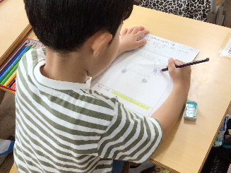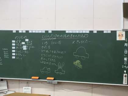 同じ時間帯、1年1組では大浦先生がこども乗り物デザイン展の説明をし、子どもたちがおもいおもいの作品を描いていました。