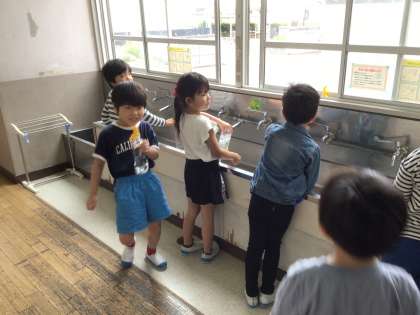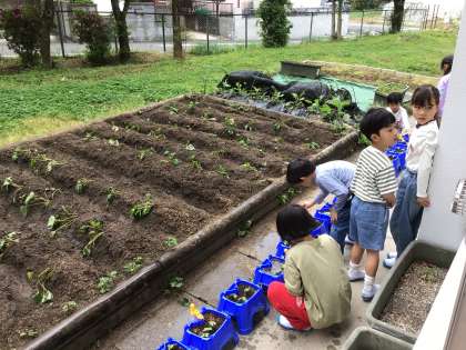 1年生は、教室前にある花壇に植えられたお芋さん、鉢植えのあさがおに水やりをするのが朝の日課になっています。
