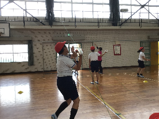 今までも何度かお伝えしてきたボール投げへ向けてのトレーニング、今日は5年1組さんが練習をしていました。