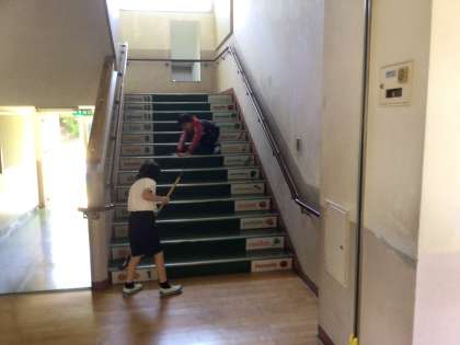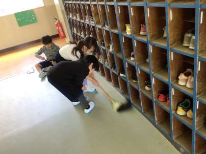縦割りのお兄さん、お姉さんと一緒に清掃中です。 全校でさまざまな場所の掃除をしています。