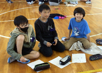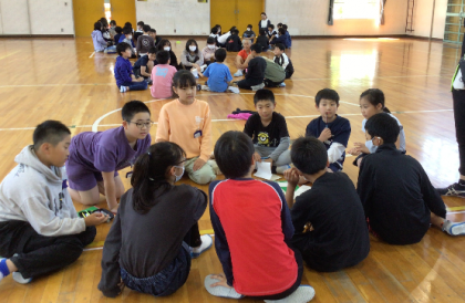 体育館では6年生の子たちに5年生の子たちが質問をしていました。