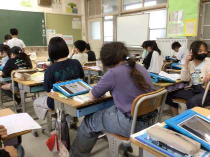 学習用タブレットに格納されている副読本「豊田」を利用して、調べ学習に真剣に取り組んでいました。