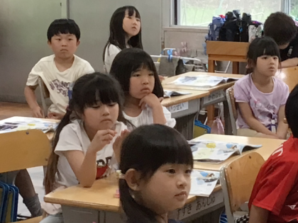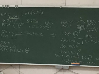 1年2組の教室ではシャボン玉遊びの動画を見ていました。