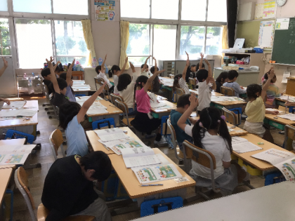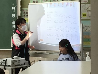 前に出て、発表した女の子が先生に〇がもらえて、喜んで席に戻る様子です。