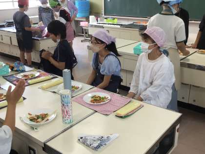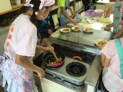 6年1組さんが家庭科の調理実習で、野菜炒めを作りました。