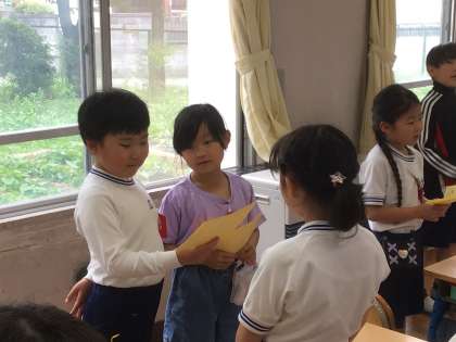 今朝のパワーアップタイム、2年生のみなさんが1年生の教室を訪れ、27日(月)に行う学校探検の招待状をペアの子に渡しました。
