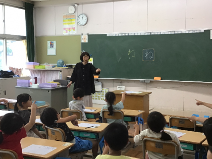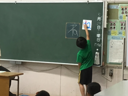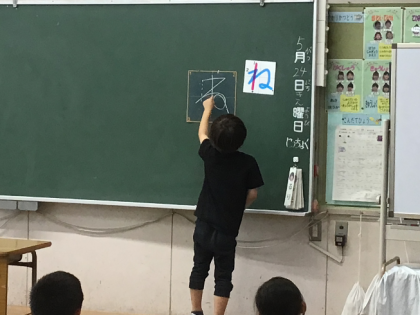 2組さんでは、先生がわざと形の悪い字を書いて、みんなで確認する授業をしていました。