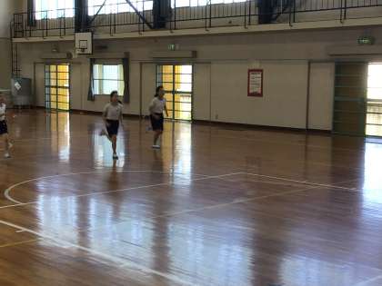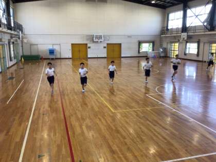 5年1組さんが体育館でシャトルランに挑戦中です。