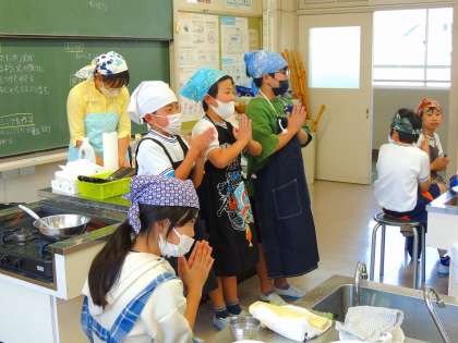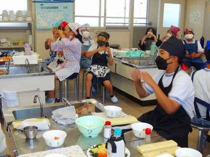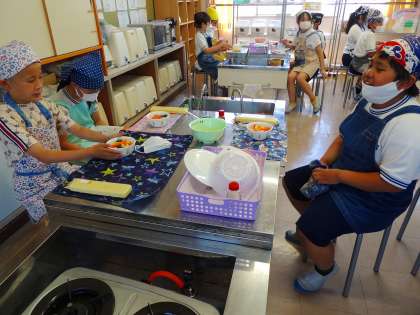 5年生。いよいよゆで野菜とドレッシングが完成し、実食です。