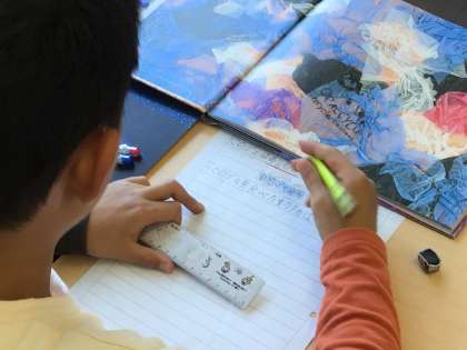 図書館などで本を借りてきたり、学習用タブレットで調べたりして、自分のテーマに合うものを調べていました。
