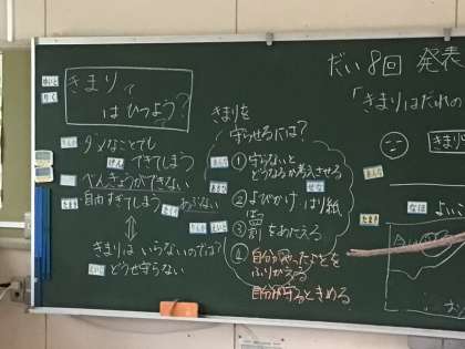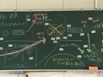 授業が進んでいく中で「きまりがなければ、今は楽しい」「あの時、ちゃんとやっておけばと後悔する」「大人になって困る」(これは宿題のことを想像して話しているのかな?)