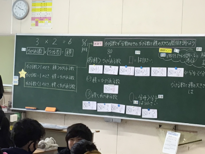 6年1組さんでは「かける数が分数のときの、かける数と積の大きさの関係を調べよう」という授業が行われていました。