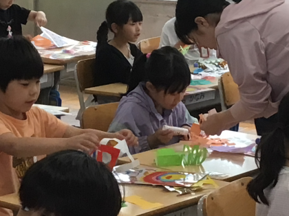 1年生 図工の授業です 公開日 2024/05/31 更新日 2024/05/31 校長室から 1年1組さんでは靖葉先生が図工の授業を行っていました。 はさみで切った画用紙を5枚ノリでくっつけて、作品をつくる授業でした。