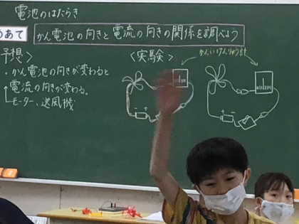 めあては「かん電池の向きと電流の向きの関係を調べよう」です。