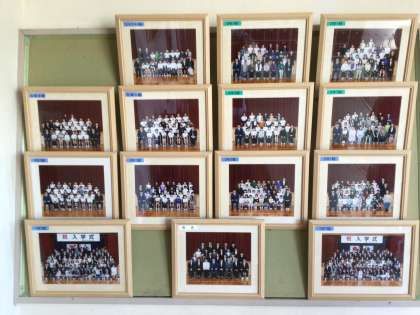 職員室前に学級写真、職員写真を掲示しているコーナーがあります。