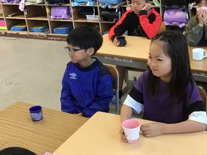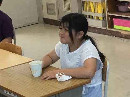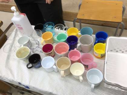 3年1組さんでは配膳台にコップを持ってきて、先生が液を入れていました。