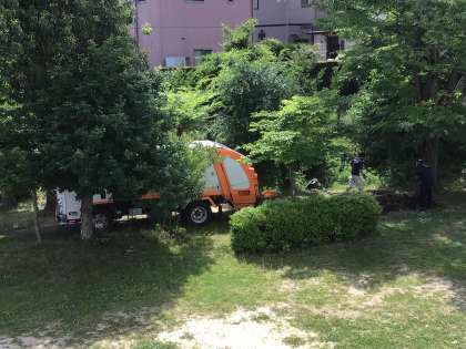 ちょっと残念なお知らせ?? 公開日 2024/06/06 更新日 2024/06/06 校長室から 美里1丁目お助け隊のみなさんが、切ってくださった校内の木ですが、本日、業者の方が処分をしに来てくれました。 校内整備員の黒木さん曰く「とても固い木で燃えにくいので薪などで利用することが難しいです」と話されていた木です。 みなさんが遊んでいたり、椅子のように座ったりして使っていましたが、そのまま置いておくのはよくないということで、中川先生が処分をお願いしてくれました。