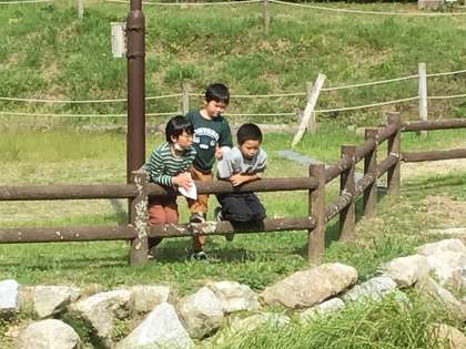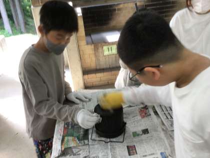 ご飯ができたので飯盒の裏を新聞で磨いている班もあったり、束の間の休憩で川を眺めている子もいました。