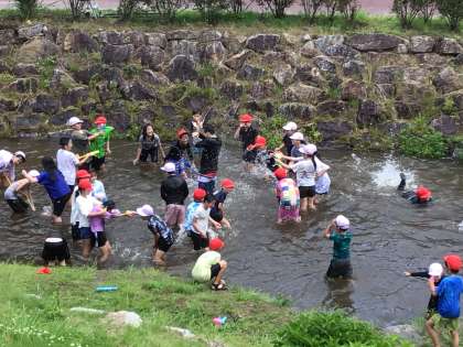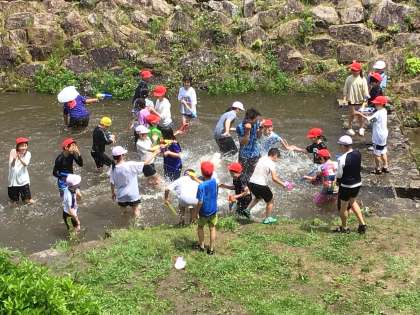 先生たちが入ると、一気にみんなが集まって、水の掛け合いが始まります。