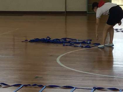 気合の入りまくった男の子が足を動かすと、どこかでラダーが足に絡んでしまい、下の写真のようになりました。すると、優しい2組の女の子たちがササッと出てきて、元のように直してくれていました。