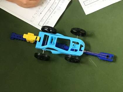 3年2組さんでは理科で「ゴムの力で走る車のふしぎを見つけよう」という授業が行われていました。