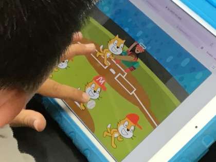 ゲームの子たちはプログラミングでスクラッチに挑戦中です。