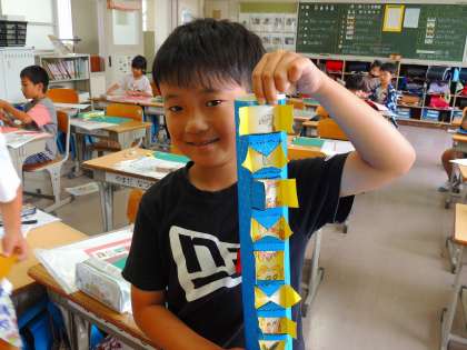 2年生は図工「まどからこんにちは」の学習で、窓のある建物を作っています。