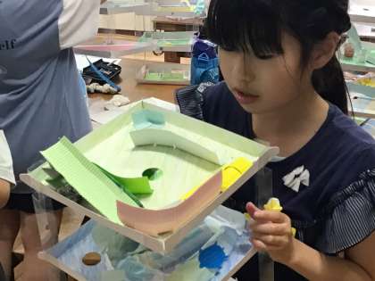 4年1組さんが完成した「コロコロガーレ」、友だちの作品のいいところ、おもしろいところを見つけようという鑑賞の授業を行っていました。
