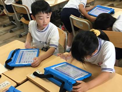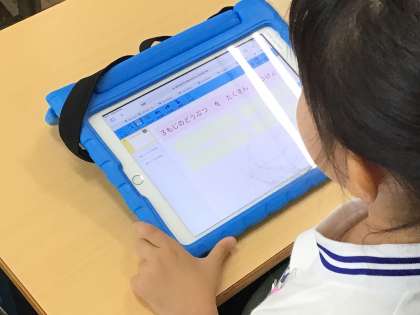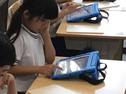 1年生2クラスともにタブレットで発表ノートの使い方を勉強していました。