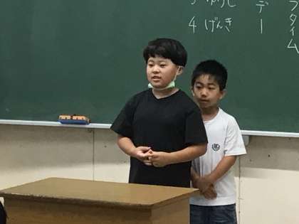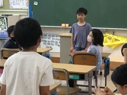 4年1組さんでは夏休みに楽しみなこととして、家族でキャンプに行くことを話してくれました。アスレチックみたいなものがあればやってみたいし、こども園の頃の友達と一緒に行けるといいなぁと話していました。手を挙げた子が「私の家はキャンプに行ったことがないので、どんなものがあるといいか、教えてください」と話していました。