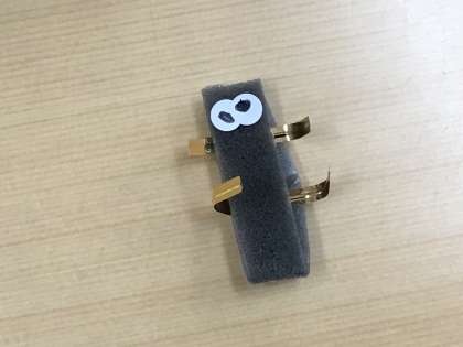 湊谷先生が準備してくれたスポンジの裏に両面テープ(すきまテープというそうです)を張ります。テープを上手にめくり、2つ折りにします。手や足をくっつけます。手や足を動かして変化をつけます。目玉シールを自分の好みに応じて選んで貼り付けます。