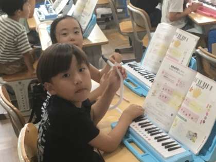 1年生 音楽の授業です 公開日 2024/07/03 更新日 2024/07/03 校長室から 1年1組さんでは鍵盤ハーモニカを使って、演奏の練習をしていました。 どの指を使って、鍵盤を押すかを教えてもらっていました。