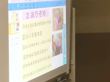 1年生のみんながアサガオから色をぬき、「おりぞめ」を行いました。