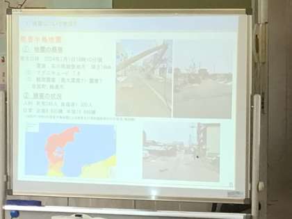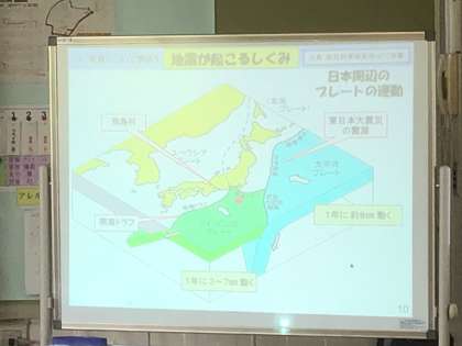 地震の起こるメカニズムには「内陸型」と「海洋型」があること、1月に起こった能登半島での地震のお話をしてもらっています。