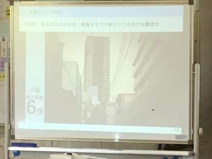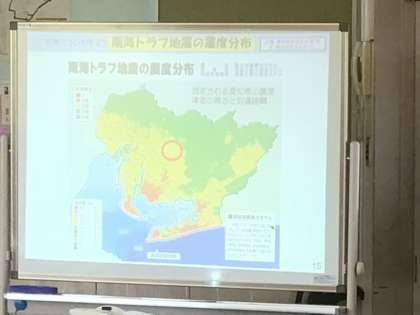 次に「南海トラフ巨大地震」が仮に起こるとすると、豊田市ではどれくらいの規模の地震が起こるのか?、実際に起こった際にどうなるのか?をCGなどを使って見せてもらいました。