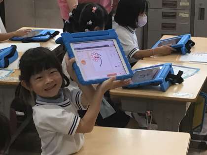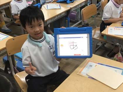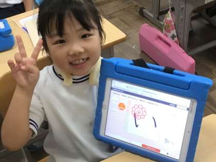 国語のアプリをやってみました。あ・い・う・え・お … が正しく書かれているか判定してくれるアプリです。上手に書けると花丸がもらえます。花丸がでると「先生、花丸だよ」「見てみて、ほら!」と、ニッコリ笑顔です。