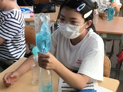 一人1つずつ道具をもらって、ペットボトルをふって水が落ちていく様子を観察しました。