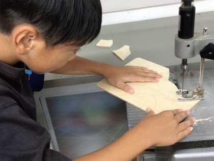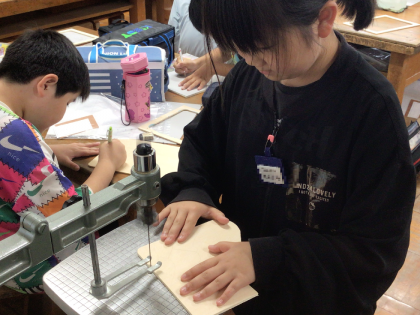 5年2組のみなさんが、糸のこに挑戦中です。