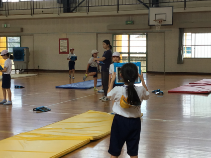 4年2組さんが体育の授業でマット運動に取り組んでいました。