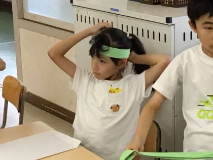 3年2組さんでは、5時間目の時間を使って、ハチマキの結び方を教えてもらっていました。
