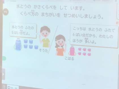 今日は「水とうの かさくらべをしています。くらべ方のまちがいをせつめいしましょう」という問題に取り組みました。