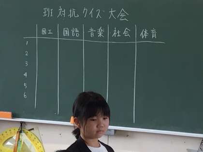 5年2組さんの黒板に「班対抗クイズ大会」「図工、国語、音楽、社会、体育」と書かれていました。
