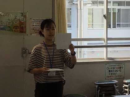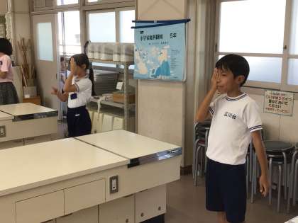 担任の先生、養護教諭の先生に視力を検査してもらっています。