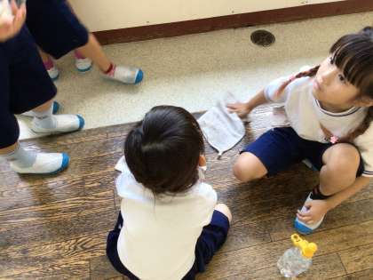 ティッシュなど、自分たちの持っているもので拭いていました。近くにいた子も一緒に手伝いながら拭いていたので「7組さんから雑巾を借りよう」と提案しました。「借りた雑巾は自分たちで返せるかな?」と聞くと、「うん、大丈夫!できるよ」と話していました。