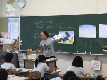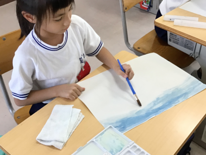 2年1組さんでは、左官先生が「空の塗り方」をアドバイスしながら、実際に色をつけていました。